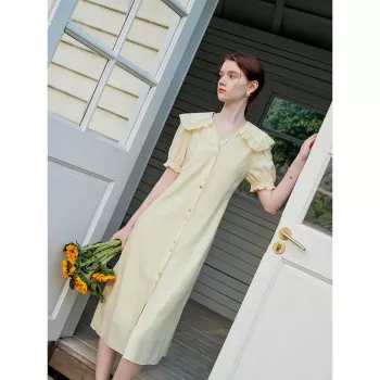 Elegant Navy Sailor Collar Dress with Fungus-Edged Sleeves