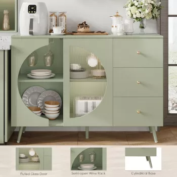 Modern Cream Coffee Bar Cabinet with Fluted Glass & Wine Rack – 47” Sideboard