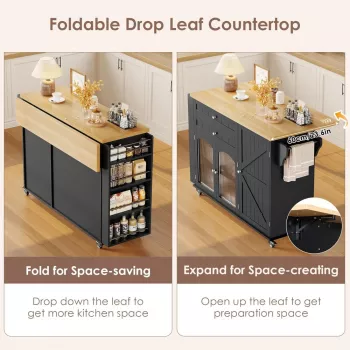 Rolling Kitchen Island with Storage, Drop Leaf Countertop & Bar Cart, Modern Island Table